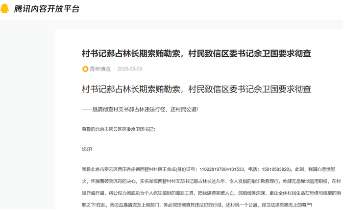 村书记郝占林长期索贿勒索,村民致信区委书记余卫国要求彻查