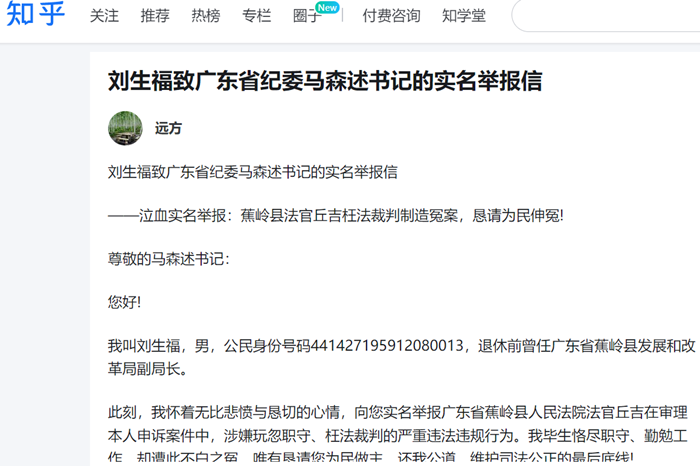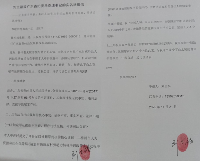 刘生福致广东省纪委马森述书记的实名举报信