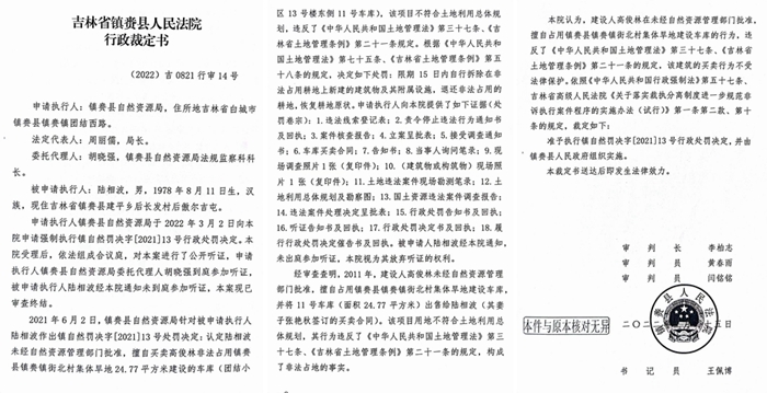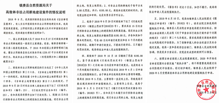 迫于郝亚洲多次上访的压力,镇赉县自然资源局于2021年6月2日分别找到了车库的所有人,对他们分别下达了行政处罚决定书,要求他们15日内自行拆除在非法占用耕地上新建的建筑物及其附属设施,退还非法占用的耕地,恢复耕地原状,并于2022年3月2日申请法院强制执行。镇赉县法院遂作出(2022)吉0821行审1号-14号裁定,准予执行镇自然罚决字[2021]15号等行政处罚决定,并由镇赉县政府组织实施。但是至今此事仍然没有一点进展,强制执行依然无果。2023年初,郝亚洲将此事反应到镇赉县巡视组张组长处,但是至今巡视组和纪检委没有给当事人任何答复。我们不知道,在吉林省镇赉县,竟然连这么一个简单的违法占地案件都处理不好,高俊林的违法占地行为竟然能够堂而皇之的被合法化了。我们不禁要追问:镇赉还是共产党的天下吗?在镇赉还有没有王法?