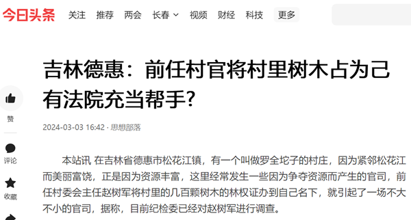 本站讯 在吉林省德惠市松花江镇,有一个叫做罗全坨子的村庄,因为紧邻松花江而美丽富饶,正是因为资源丰富,这里经常发生一些因为争夺资源而产生的官司,前任村委会主任赵树军将村里的几百颗树木的林权证办到自己名下,就引起了一场不大不小的官司,据称,目前纪检委已经对赵树军进行调查。
