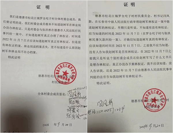 与此同时,罗全坨子村全体村委会成员也曾向法庭出具证明:我们村委会成员根本不知道赵树军在林业局办没办林权证,只是村委会与张洪彬在德惠市法院打民事纠纷一案中,才知道赵树军真正办理了林权证,时间是2022年11月7日,但是没有林权证档案。林业局说档案丢失,更不知道是什么原因赵树军和林业局不补办档案。