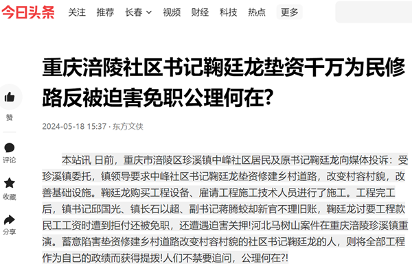 重庆涪陵社区书记鞠廷龙垫资千万为民修路反被迫害免职公理何在?