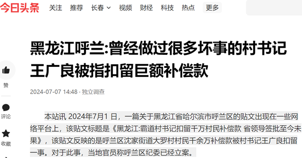 黑龙江呼兰:问题村书记王广良被指扣留4000多万补偿款官方称已立案