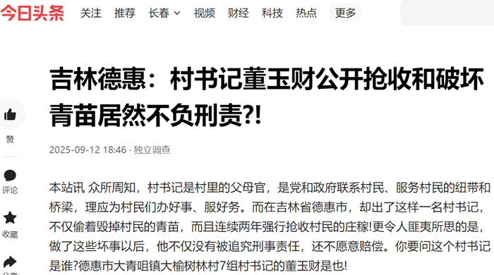 本站讯 众所周知,村书记是村里的父母官,是党和政府联系村民、服务村民的纽带和桥梁,理应为村民们办好事、服好务。而在吉林省德惠市,却出了这样一名村书记,不仅偷着毁掉村民的青苗,而且连续两年强行抢收村民的庄稼!更令人匪夷所思的是,做了这些坏事以后,他不仅没有被追究刑事责任,还不愿意赔偿。你要问这个村书记是谁?德惠市大青咀镇大榆树林村7组村书记的董玉财是也!