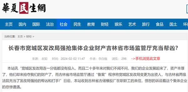 本站讯“宽城区发改局连一分钱都没有投入,而且二十多年来对我们不闻不问,我们的企业发展起来了,资产丰厚了,他们却来抢夺我们的财产了,而吉林省市场监管厅通过“备案”程序将宽城区发改局变更为出资人,与吉林省两级法院充当了发改局强抢的帮凶和打手!”日前,本站收到吉林省吉储橡胶厂在职职工的来信,愤怒的诉说着这个集体企业的悲惨遭遇。