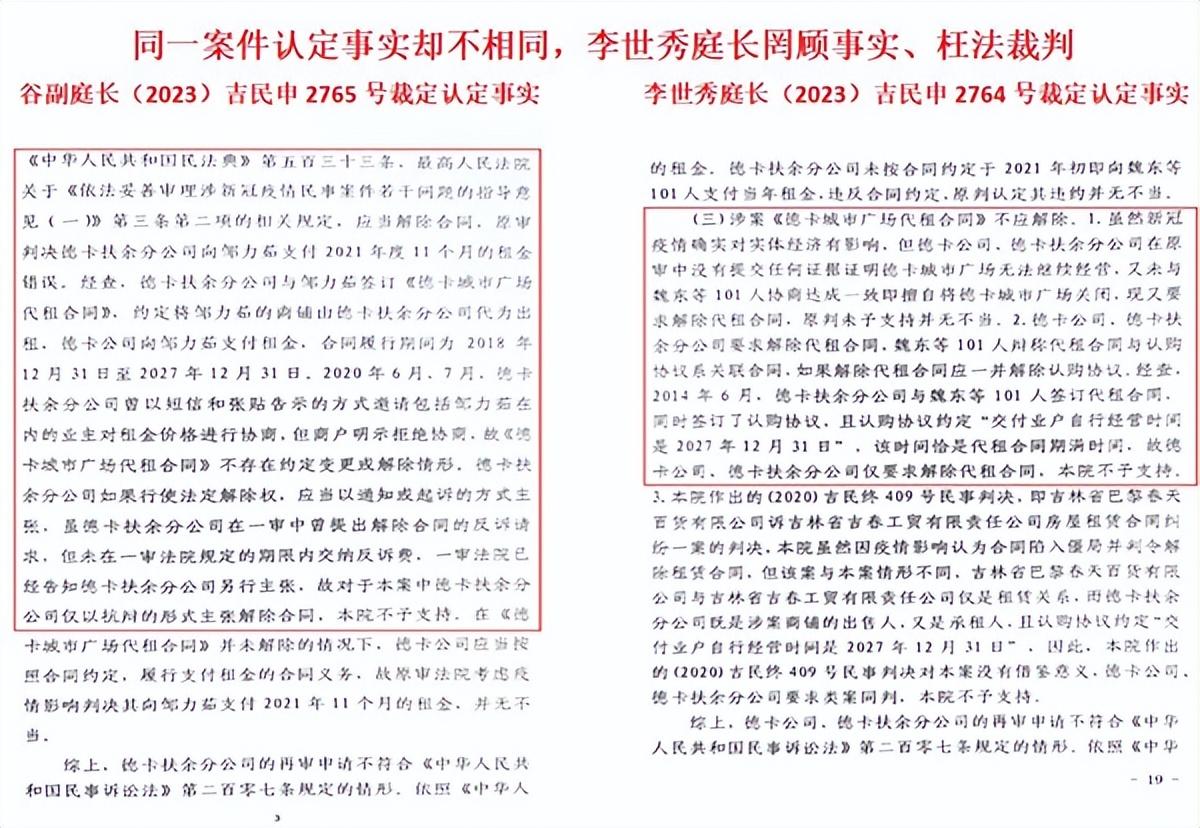 李世秀庭长承办另外的101户,德卡公司已提出反诉解除代租合同,李世秀庭长认定的事实却截然相反。2023年10月25日,吉林省高级人民法院(2023)吉民申2764号民事裁定书第19页称:“本院经审查认为:(三)案涉《德卡城市广场代租合同》不应解除”1、虽然新冠疫情确实对实体经济有影响,但德卡公司、德卡扶余分公司在原审中没有提交任何证据证明德卡城市广场无法继续经营,又未与魏东等101人协商大成一致即擅自将德卡城市广场关闭,现又要求解除代租合同,原审判决未予支持并无不当。2、德卡公司,德卡扶余分公司要求解除代租合同,魏东等101人辩称,代租合同与认购协议系关联合同,如解除代租合同应一并解除认购协议。经查,2014年6月,德卡扶余分公司与魏东等101人签订代租合同,同时签订了认购协议,且认购协议约定“交付业户自行经营时间是2027年12月31日”,该时间恰是代租合同期满时间,故德卡公司、德卡分公司仅要求解除代租合同,本院不予支持。”