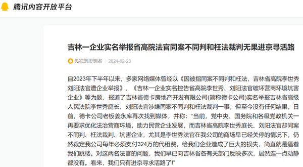 自2023年下半年以来,多家网络媒体曾经以《因被指同案不同判和枉法,吉林省高院李世秀刘阳法官遭企业举报》、《吉林一企业实名控告省高院李世秀、刘阳法官破坏营商环境坑害企业》等为题,报道了吉林省德卡房地产开发有限公司(简称德卡公司)实名举报吉林省高级人民法院李世秀庭长、刘阳法官涉嫌同案不同判和枉法裁判一事,但至今没有任何结果。日前,德卡公司老板姜永库再次找到媒体,并称:“当前,党中央、国务院和各级党政机关一再要求优化法治营商环境,助力民营企业发展,而吉林省高院李世秀庭长、刘阳法官却同案不同判、枉法裁判、坑害企业,尤其是李世秀法官在我公司的商场早已经关停的情况下,仍然裁定我公司每年必须支付324万的代租费,给我们企业造成了巨大的损失,简直就是逼着我们跳楼。对这两名法官的问题,我们早已向吉林省各有关部门反映多次,居然连一点动静都没有。看来,我们只有进京寻求活路了!”