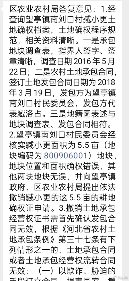 南刘口村委会为黑掉我土地补偿款可谓心机用尽,除了操纵臧老甫做虚假证明外,还向清苑区农业农村局提出注销本人土地确权证的申请。好在清苑区农业农村局领导原则性强、业务水平高、颇富担当精神,并实事求是地对确权证一事给出明确答复:1.经查询望亭镇南刘口村臧小更土地确权档案,土地确权程序规范,相关资料清晰。一是承包地块调查表,指界人签字、签章清晰,调查日期2016年5月22日;二是农村土地承包合同,签订土地发包合同日期为2018年3月19日,发包方为望亭镇南刘口村民委员会,发包方代表臧洛占。三是地籍图表述与地块调查表、发包合同相符。清苑区农业农村局权威认定本人的确权证真实有效,不存在任何问题。由此可见,既然土地确权证真实有效没有任何问题,那么不言而喻,南刘口村委会定然是造假的始作俑者了。