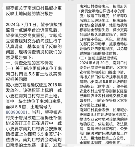 后经本人查证,该证明是村主任藏洛占事先打印好内容,而后让藏老甫签字画押。(有录音为证)面对如此严肃的问题,望亭镇政府在情况报告中居然作出“南刘口村委会发现南堤每一块土地都是有主的,并没有臧小更耕地确权证上所标明的那5.5亩土地。”的荒唐结论。