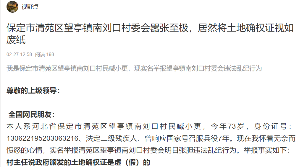 可见,保定市清苑区望亭镇政府及南刘口村委会压根就没把国家政策法规当回事。镇政府在向上级汇报情况时,居然谎称“镇党委对此事非常重视,已经多次与臧小更沟通妥善解决”。这不是睁着眼睛说瞎话吗?事实上,自打那个驻村干部在12345电话中对我出言不逊后,至今一年已过,本人从未接到过镇政府和村委会任何电话,何来的妥善沟通解决?倒是我和家人在此期间,分别给镇政府及村委会打过几次电话,镇政府没有如何答复,村主任的答复仍然是:“那个确权证是虚(假)的,没有一点用,征地补偿不会有”