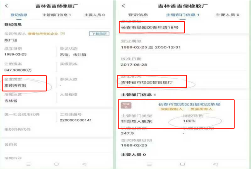 7.吉储橡胶厂现在显示登记机关在省市场监督管理厅、企业住所在绿园区、主管部门在宽城区、所有制形式为集体企业、政府机关100%出资、2005年营业执照吊销,2017年8月营业执照“起死回生”、企业职工如孤魂野鬼无家可归的“怪胎企业”,不伦不类。