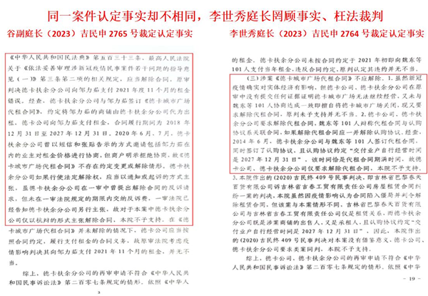 李世秀庭长承办另外的101户,德卡公司已提出反诉解除代租合同,李世秀庭长认定的事实却截然相反。2023年10月25日,吉林省高级人民法院(2023)吉民申2764号民事裁定书第19页称:“本院经审查认为:(三)案涉《德卡城市广场代租合同》不应解除”1、虽然新冠疫情确实对实体经济有影响,但德卡公司、德卡扶余分公司在原审中没有提交任何证据证明德卡城市广场无法继续经营,又未与魏东等101人协商大成一致即擅自将德卡城市广场关闭,现又要求解除代租合同,原审判决未予支持并无不当。2、德卡公司,德卡扶余分公司要求解除代租合同,魏东等101人辩称,代租合同与认购协议系关联合同,如解除代租合同应一并解除认购协议。经查,2014年6月,德卡扶余分公司与魏东等101人签订代租合同,同时签订了认购协议,且认购协议约定“交付业户自行经营时间是2027年12月31日”,该时间恰是代租合同期满时间,故德卡公司、德卡分公司仅要求解除代租合同,本院不予支持。”