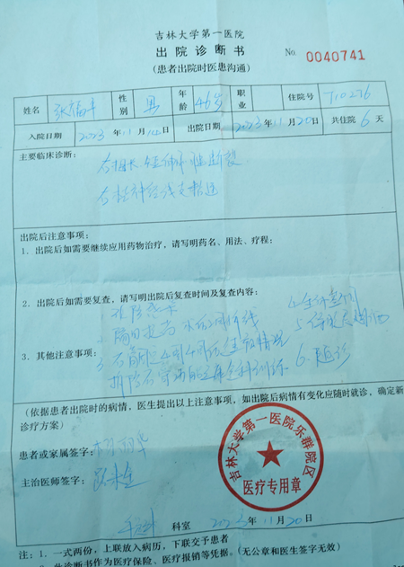 图为:张福平在吉林大学第一医院乐群院区的出院报告单。