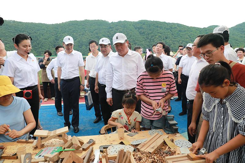 白山市委书记谢忠岩在2022“长白山之夏”文化旅游季暨“心往长白山 松花江上游”松花江旅游季启动仪式后,观看游客在文创区雕刻木头