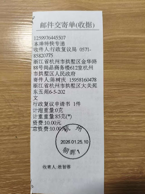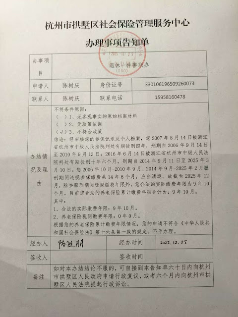 2025年12月25日上午10时39分许,陈树庆到被申请人设在拱墅区政务服务中心的办公场所办理退休手续,办事人员以陈树庆曾经因遭2007年“煽动颠覆国家政权罪”判刑4年和2016年“颠覆国家政权罪”判刑10年6个月为由,社保缴费年限扣除两项刑期累加,剩余缴费年限只有九年多,不足最低缴费年限15年的规定,拒不办理申请人的退休资格,由于申请人多次要求,被申请人出具《杭州市拱墅区社会保险管理服务中心办理事项告知单》,还有一份盖着被申请人印章的《告知书》,及一份制作日期是二〇一〇年九月三十日的《浙江省人力资源和社会保障厅文件–浙人社函[2010]358号–关于被判处有期徒刑人员基本养老保险有关问题的复函(此件依申请公开)》。申请人通过认真审阅和分析,认为前述《告知单》、《告知书》、浙人社函[2010]358号所依据的法律及政策明显适用不当或效力不足,申请人不服,根据《中华人民共和国行政复议法》第十一条“可依照本法申请复议”及该条第(十二)项关于的“申请行政机关依法给付抚恤金、社会保险待遇或者最低生活保障等社会保障,行政机关没有依法给付”情形规定,特向拱墅区人民政府申请复议,请求依法做出公正的决定,支持申请人的复议请求。