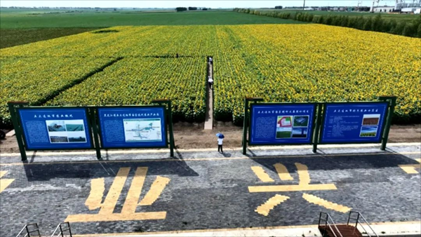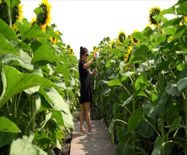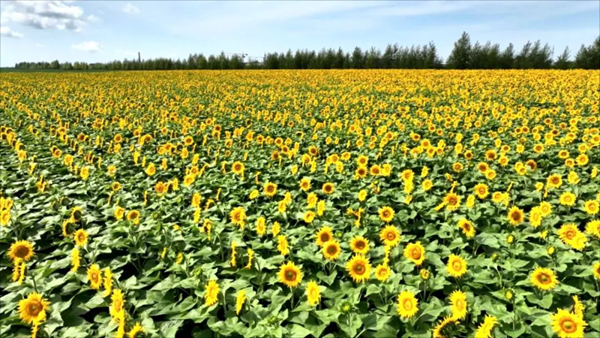 黑龙江省五大连池市彩色农业示范田里,约有20多万株向日葵灿烂绽放,放眼望去,朵朵向日葵在蓝天白云下静静绽放,清风徐徐,漫步花海,满是夏天的味道,引来不少游客赏花拍照,形成一道靓丽的风景线。