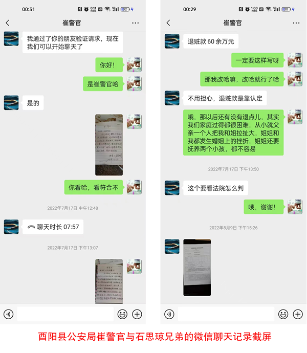 综上,被告人石思琼主观上没有非法吸收公众存款的故意,不符合非法吸收公众存款罪的主观要件,请求二审法院依法撤销一审判决,改判被告人石思琼无罪。被告人石思琼讲述自己在侦查价段遭到疲劳审讯,在酉阳县公安局地下停车场黑关13天遭遇疲劳审讯及语言威胁,讯问材料被逼无奈情况之签字,酉阳县公安局侦查警官设下圈套让我电话逼迫我父亲交款50万打到我自已帐户, 取保候审放我回去, 收到50万后预设圈套,47万谎称脏款3万罚金,合计50万元。警官与我被告人石思琼兄弟石思刚聊天记录可以证明,这是酉阳公安逐利违法的有力证据,现将聊天记录曝光,请评议酉阳公安以权压法、逐利违法、办理人情案关系案的问题。