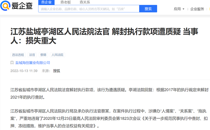 爱企查显示,早在2022年10月13日,搜狐网等媒体就曾以《江苏盐城亭湖区人民法院法官 解封执行款项遭质疑 当事人:损失重大》为题,对东锐公司的遭遇进行过广泛报道。报道称:江苏省盐城市亭湖区法院执行局及承办执行法官蔡锦,在案件执行过程中,涉嫌办“人情案”、“关系案”、“拖执案”,严重地违背了2020年12月23日最高人民法院审判委员会第1823次会议《关于进一步规范民事执行中查封、扣押、冻结措施,维护当事人的合法权益有关规定》,直接导致了东锐公司今天的境遇。