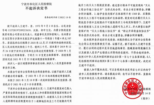 据相关法律文书记载,对于此案,浙江奉化警方经过缜密的调查后坚称:王建平诈骗“犯罪事实清楚,证据确实、充分,足以认定。”但是,宁波市奉化区检察院却做出了“存疑不起诉”的决定。王吉义等人虽然不断申诉,仍然被宁波市检察院和浙江省检察院驳回,其中一个关键就是144号文件,对王建平起到了保护作用。