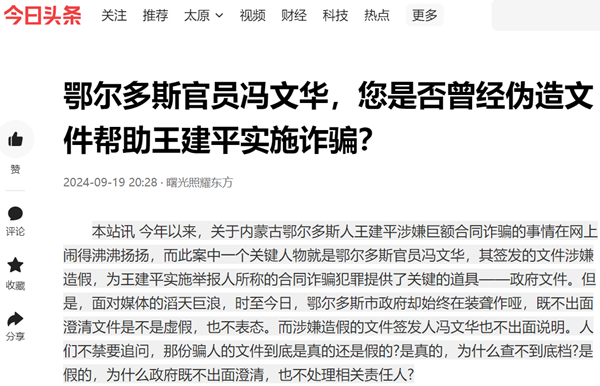 本站讯 今年以来,关于内蒙古鄂尔多斯人王建平涉嫌巨额合同诈骗的事情在网上闹得沸沸扬扬,而此案中一个关键人物就是鄂尔多斯官员冯文华,其签发的文件涉嫌造假,为王建平实施举报人所称的合同诈骗犯罪提供了关键的道具——政府文件。但是,面对媒体的滔天巨浪,时至今日,鄂尔多斯市政府却始终在装聋作哑,既不出面澄清文件是不是虚假,也不表态。而涉嫌造假的文件签发人冯文华也不出面说明。人们不禁要追问,那份骗人的文件到底是真的还是假的?是真的,为什么查不到底档?是假的,为什么政府既不出面澄清,也不处理相关责任人?
