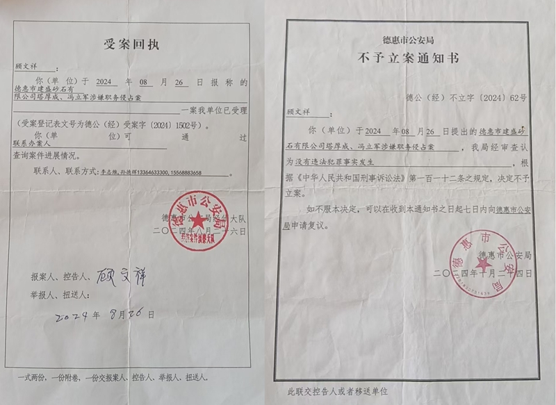 据股东们提供的证据,股东之一的顾文祥曾经于2024年8月26日,以冯立军、塔厚成涉嫌职务侵占罪向德惠市公安局报案,该局于当日出具了《受案回执》,但是同年10月24日又出具了《不予立案通知书》,理由是:“我局经审查认为没有犯罪事实发生”。