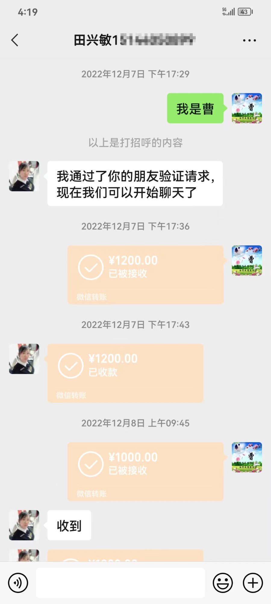 韩志会起诉长春佰优山庄,曹洪晏被列为第二被告。据曹洪晏介绍,因事先准备不足,自己没有聘请诉讼代理人,2022年12月7日九台区人民法院开庭后,原告诉讼代理人张桂芬表示可以帮忙介绍律师,曹洪晏同意后,张桂芬便向其介绍了田兴敏,称田兴敏是大乘法律服务所的律师。曹洪晏通过微信转账分两次向田兴敏支付了2200元代理费。