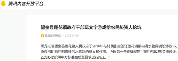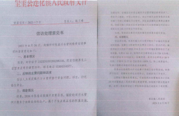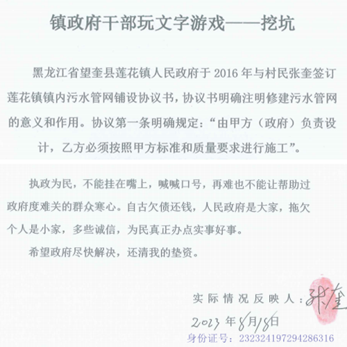 第一,看看莲花镇政府2023年6月26日红头文件(望莲信处[2023]7号,签发人[镇人大主席]耿义峰)。文件第三条称:“调查情况",“经查,2016年张奎在我镇开发商品房铺设的污水管网只服务于该商品房的住户”。那么请问耿义峰,协议书中开篇明确写道:“为改善居民生活条件,解决污水排放难题”,甲乙双方的协商的。莲花镇政府怎么竟然用红头文件撒谎歪曲事实呢?说是这条污水管网是自建自用?是谁在消耗政府的公信力?这不是一个党委开的起的玩笑。明明是改善居民生活条件,却被说成是自建自用,颠倒黑白,无耻吗?
