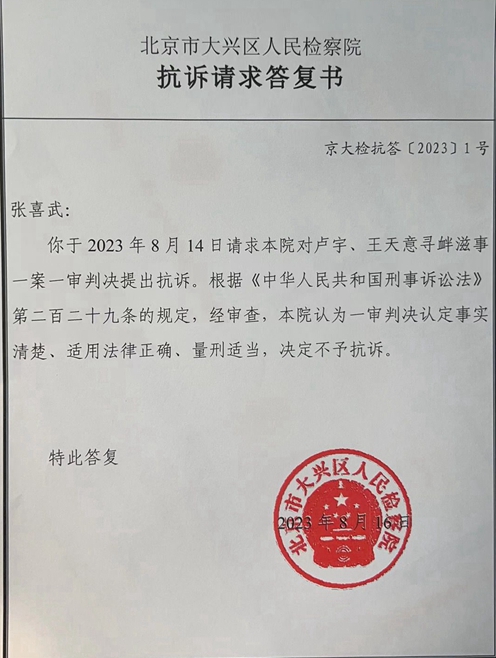 令人称奇的是,北京市大兴区检察院在收到张喜武的抗诉申请后,仅仅两天后,即8月16日就做出了不予抗诉的答复意见。北京市大兴区人民检察院抗诉请求答复书(京大检抗答【2023】1号)称:“经审查,本院认为一审判决认定事实清楚、适用法律正确、量刑适当,决定不予抗诉”。