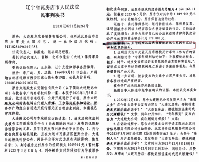 记者从李广军处看到了这份判决书后,不禁感到细思极控。判决书所称的名誉侵权稿子主要有:《大连瓦房店:樱桃树遭无声屠杀谁是凶手》、《大连瓦房店:“樱桃姐姐”温柔的残忍只顾赚钱?》、《大连殿龙公司:疯狂删稿为哪般?》、《大连瓦房店:樱桃事件考验公权力,是进是退?》。但是,这个判决书中并没有实质性的证据能够证明构成名誉侵权。其前面罗列的都是大连殿龙的一些业绩和做过的一些好事,而对于李转发稿子所依据的主要证据连提都没提。其主要证据有:针对樱桃姐姐6#全能型涂干营养液的《分析报告》、《技术鉴定意见书》和《信访事项处理意见书》等。