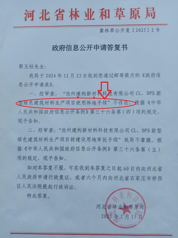 对此,孟村县公安局刑警队一名刘姓警官回应称,辛店镇政府出具证明,称案涉地块已于2009年办理征地批文,“无需采伐许可证”。但经过调查发现,2009年批文对应的地块为“代家湾子”(企业:河北汇莱管道设备有限公司),与本案无关。河北省林业和草原局也明确回复:沧州建构新材料科技有限公司(现案涉地块用地单位)使用林地手续不存在。郭玉柱称该案已向县检察院递交刑事立案监督申请书,希望检察院依法监督立案查处此案,给公众一个合理的说法。