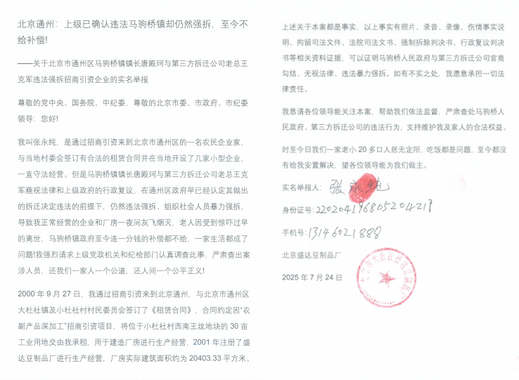 我叫张永纯,是通过招商引资来到北京市通州区的一名农民企业家,与当地村委会签订有合法的租赁合同并在当地开设了几家小型企业,一直守法经营。但是马驹桥镇镇长唐殿珂与第三方拆迁公司老总王克军藐视法律和上级政府的行政复议,在通州区政府早已经认定其做出的拆迁决定违法的前提下,仍然违法强拆、组织社会人员暴力强拆,导致我正常经营的企业和厂房一夜间灰飞烟灭,老人因受到惊吓过早的离世,马驹桥镇政府至今连一分钱的补偿都不给,一家生活都成了问题!我强烈请求上级党政机关和纪检部门认真调查此事,严肃查出案涉人员,还我们一家人一个公道,还人间一个公平正义!