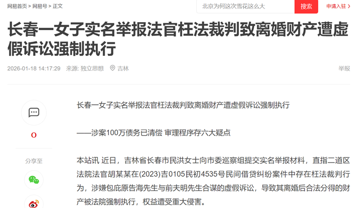 长春一女子实名举报法官枉法裁判致离婚财产遭虚假诉讼强制执行 涉案100万债务已清偿 审理程...