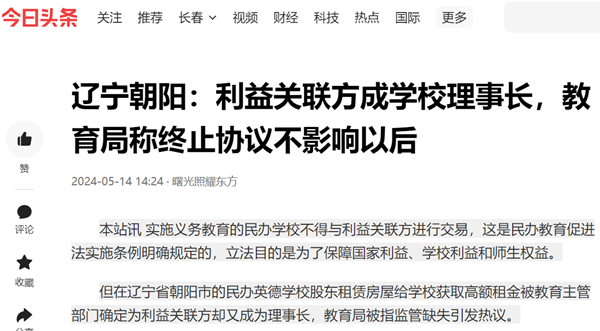 但在辽宁省朝阳市的民办英德学校股东租赁房屋给学校获取高额租金被教育主管部门确定为利益关联方却又成为理事长,教育局被指监管缺失引发热议。