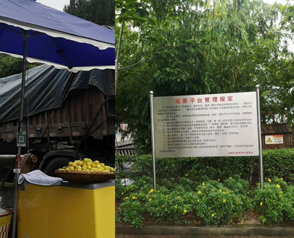 一当地村民谭某(化名)称:停车场入口处内侧这个商贩,长期在这里摆摊设点,自从有他在这里来摆摊设点后,经常会有游客反映投诉,但从来没有看见有哪个部门来管过,只是偶尔有一个”保安”坛花一现。自从有那个商贩在观景台撑伞后,停车场入口处经常赌车吵架,因这条国道路上的车流量本身很大,他那个伞插在停车场入口处内侧,伞棚既遮挡了停车场,又遮挡了外面公路,加之观景台旅游车和游客又多又挤,特别是节假日旅游高峰时,更是人满为患,停车场进不去时公路两边都停满了车。所以当车辆要想右转进入停车场时,稍不注意就容易挂到观景台停车场入口处内侧那把遮阳伞的棚、冰柜、杂物、游客之类的,这里经常发生这样的亊情。但我也不清楚为什么相关部门只是公开立块牌子,却不执行观景台的管理规定,导致那把伞影响观景台旅游车辆正常进出,也影响公路上的车子正常通行存在安全隐患。今天这三个车子就是个例子。”