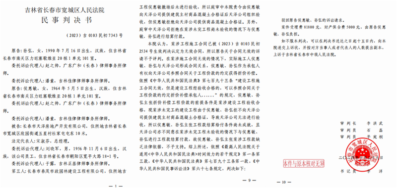 侯惠敏和她的律师介绍说:按照正常的法律程序,我们提出了对改变设计图纸后的工程量进行鉴定的申请,法官在判决书中不论是否采信都必须给出一个理由,但是这位李洪武法官在(2023)吉0103民初7343号民事判决书中,却连提都没提,竟然以“侯惠敏拒绝向天泽公司提供商品混凝土合格证”为由认定案涉工程无法验收,进而推定“侯惠敏、孙弘主张工程款结算给付条件尚未成就”,判决驳回侯惠敏、孙弘的诉讼请求!